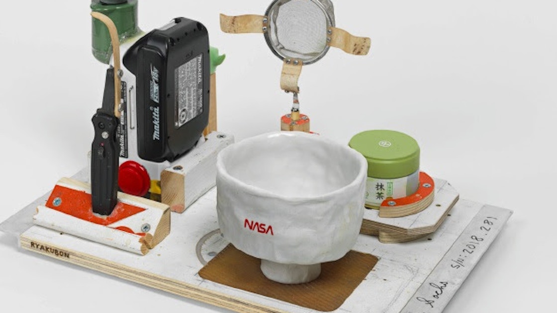 会場では「香道」を独自に解釈して制作した《Kodo》や、「NASA」のロゴが入った手製の茶碗《Fredo》など、まさに「トム・サックスの茶の湯」を体現する茶道具やしつらえの品々が並ぶ。展示のための棚もサックス自身がデザインを手がけたもので、新作と日本未発表作から約27点を見ることができる。