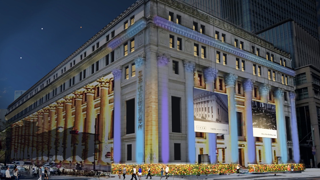 また会期中には、外壁に巨大写真が掲出。同作は、同館の開館当時の写真をホンマが独自に再撮影したもの。加えて日没から23時までは、光を用いた作品を多く手がけるアーティスト・高橋匡太のデザインによるライトアップが施され、夜の「三井本館」も楽しむことができる。