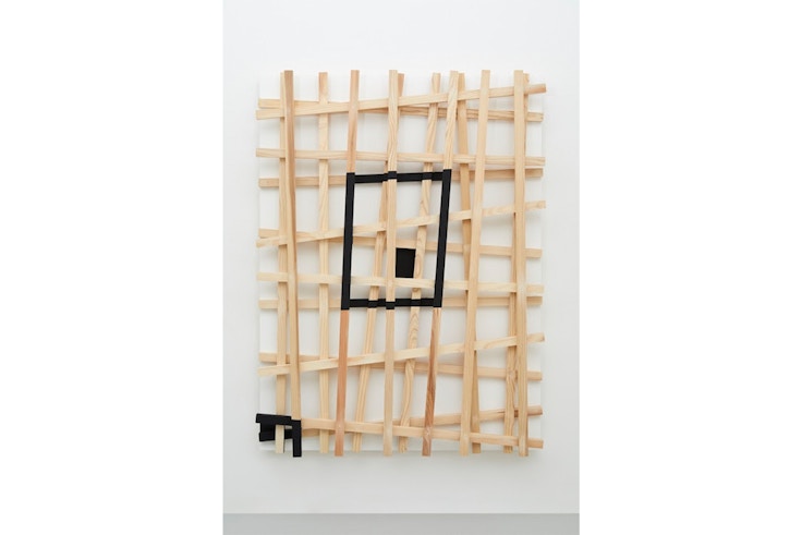 近年菅は、絵画のキャンバスを思わせる木枠を用いた作品を制作。木枠のなかにはさらに格子状の枠組みがつくられるほか、枠を越えた突起や陥没、異素材の組み合わせといった視覚効果が施されている。一見すると平面的な作品のなかには空間が生まれ、鉄や木、石などありのままのモノによる新たな構造を見ることができる。