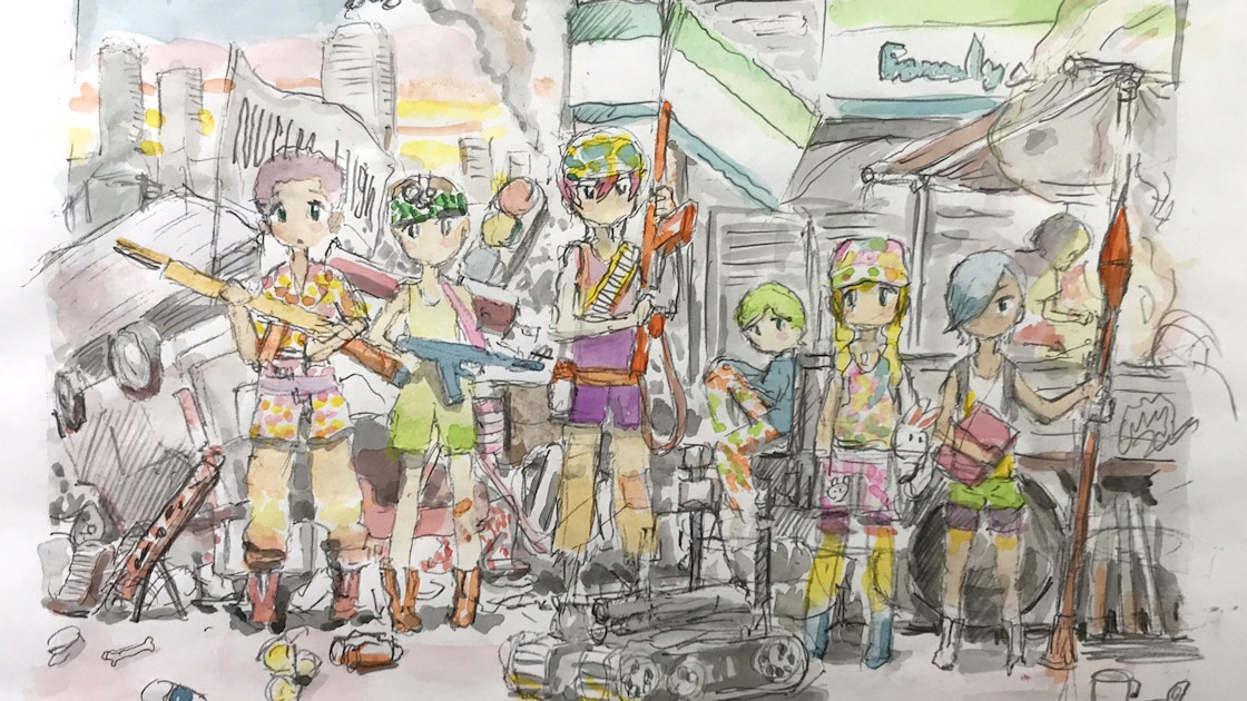 今日の社会的や政治的、環境的および技術的問題から生まれた緊張感を出発点とした本展は、若者の楽観性と可能性を探るものだという。ハイライトのひとつは、子供たちの軍隊をモチーフにした大規模な壁画。武器を持っている子供たちが未来を担う準備をする様子が描かれた作品は、今日の問題に対する解決策を見出すときに、前向きで平和的な姿勢を求めるもの。