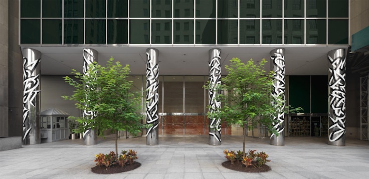 現代美術やストリート文化など、様々な現代の文化領域の「横断」を体現するQTS。その形象は、屋外の公共空間(プラザ)、屋内の公共空間(ロビー)、そして屋内の半公共空間(スカイロビー)という、3つの空間を横断する本展の構成にも重ね合わされている。15年にわたる絵画や壁画の実践を経て、さらに多様な媒体に拡大されるQTSの進化系に注目したい。なお本展は2020年8月までの長期開催。ニューヨークに滞在する機会のある方はぜひ訪れてみてはいかがだろうか。