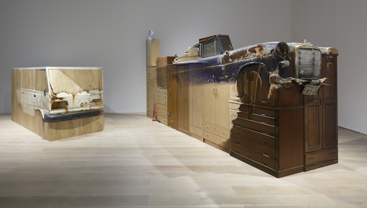 現在も宮城県を拠点とし、2011年には東日本大震災で被災した青野。当初は震災をテーマとする意思を持たなかったが、親族の実家である岩手・宮古市を訪れて風景の消失を実感したことをきっかけに、被災物を使用した作品に着手する。本展では初期から現在までの作品とともに、衣服や靴、人型のフォルムなど「人」の存在が強調された震災後の作品も紹介する。