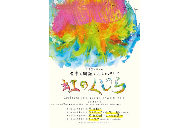 作家や画家として多岐にわたる活動を行う大宮エリーが、自身の詩と絵の作品集『虹のくじら』を音楽や朗読で楽しむイベントを開催する。