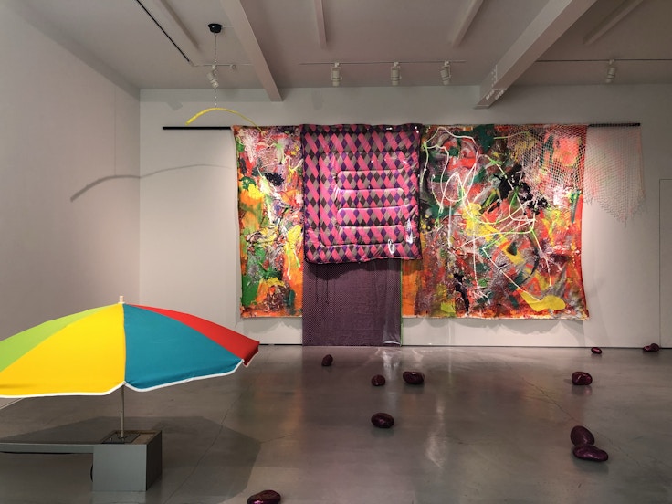 シリーズ初回を飾るのは、日常的な素材を組み合わせてカラフルな空間を構成することで知られる鬼頭健吾の個展「Full Lightness」(〜5月31日)だ。鬼頭は2019年12月に行われたプレ・オープンイベントにおいて、すでにザ・トライアングルの地上部分で《ghost flowers》を発表。本展ではこの作品に加えて、様々な素材を用いたペインティングや平面作品のほか、着彩ガラスを用いたインスタレーションなど近作・新作を披露する。
