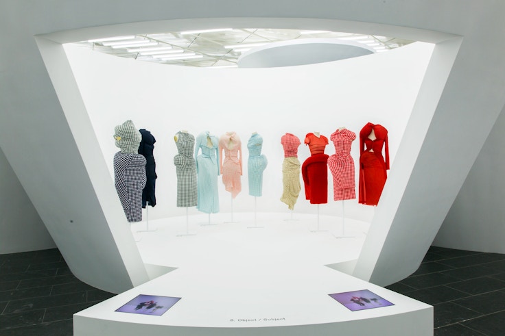 展覧会は、「西洋と東洋」「男性と女性」「過去と現在」といった、ふたつの相対するものを、「コム デ ギャルソン」によって打ち壊そうというもの。会場ではマネキンは鑑賞者と同じ目線で設置され、柵なども設けず、鑑賞者と衣服の距離が限りなく近いような構成になるという。