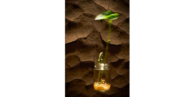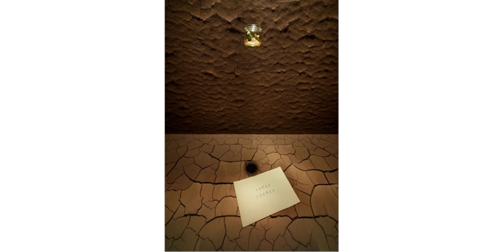 現在、SHISEIDO THE STORE WINDOW GALLERYで見ることができるのは、崔がすべての生命の母と考える土をウィンドウの壁や床一面に塗り込んだインスタレーション作品。塗り込まれた土が乾いていく過程で生じる自然の亀裂を背景に、生命の象徴そのものである小瓶に入れた種が芽吹くのを目撃することができる。