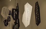 「詩の展示」である本展で展開されるのは、空間全体で言葉を体験するインスタレーション。なかでも言葉のモビールで構成される《詩になる直前の、アルティアムは。》では、紙片の表裏に記された詩の断片が言葉の連なりを生み出し、鑑賞者はその偶然から詩を切り取ることができる。