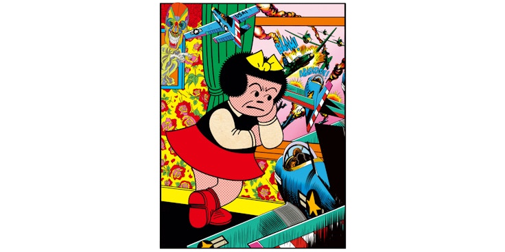 いずれも描かれているのは、田名網の実体験に基づき、ときに夢を媒介として修築された様々な記憶だという。例えば、今回田名網が新たに描いたペインティングには、日本でも戦後の朝日新聞で紹介され人気を博したアーニー・ブッシュミラーによるアメリカンコミック『Nancy』(1938)や、1966年に初放映された日本を代表する特撮ヒーロー「ウルトラマン」が、戦時下の爆撃を想起させるシーンや田名網特有の奇形生物などとともに登場。