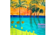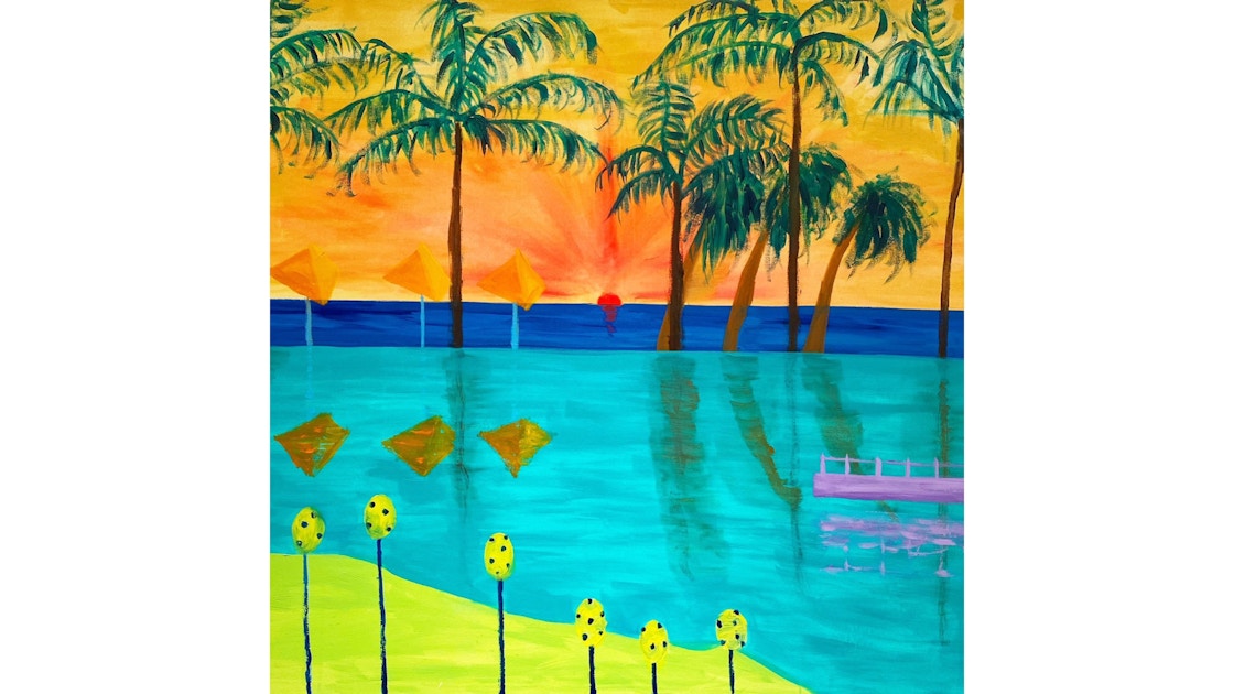 本展では、大宮がコロナ禍の自粛期間中に描いた新作を展示。これまでに訪れたリゾートを題材にした作品は、多彩な表情を持っており、夏休みの雰囲気すら漂わせる。