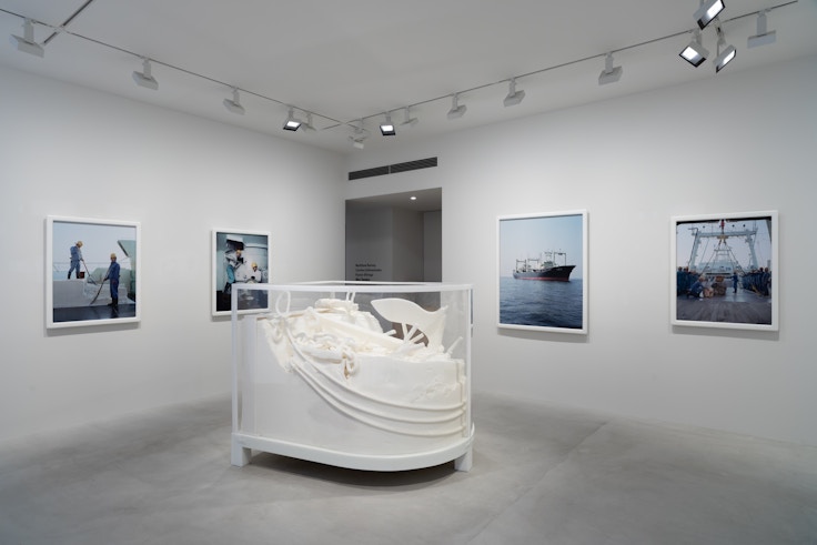 長編映画、大型彫刻、写真作品群から成る《DRAWING RESTRAINT 9》(2005)は、マシュー・バーニーの日本文化に対する研究と、そこから受けたインスピレーションの集大成であり、日本文化と「変容」との関係性を物語る。つねに多くの議論を呼んできた捕鯨工場船が映画の主人公であり、《DRAWING RESTRAINT 9》の要素のひとつである《The Cabinet of Nisshin Maru(日新丸)》(2006)は、この捕鯨船が持つ特性を強調する。本展ではこの彫刻作品を発表。同作には、自己完結型の「器」として機能し、船の錨やホースノズル、東洋からの客人たちが映画終盤で変容を遂げる際にお互いの体を切り込むナイフといった、物語の重要な要素が象られている。