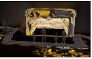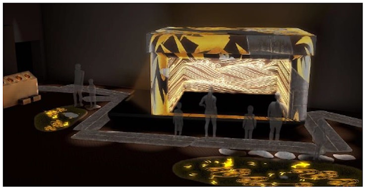 さらに、硯箱の中に人が住んでいるという「びじゅチューン!」の歌にちなみ、 展示室内に高さ約2メートルの巨大な硯箱を設置。橋を渡って硯箱に近づくと、人の動きに合わせて水面が揺れたり、水中の魚が動いたりと、光琳の世界を映像で体感できる。