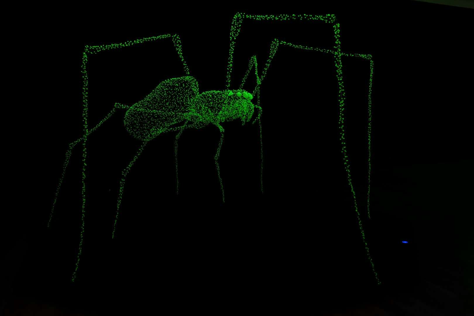 会場は、高さ8メートルにおよぶ「本棚劇場」のある同館4階「エディットタウン」。ウランガラスで制作されたシャンデリアに原発保有国の名前をつけた《クリスタルパレス:万原子力発電国産業製作品大博覧会》(2012)や、同素材でつくられ国内初公開となる《大蜘蛛伝説》(2018)など、人間と環境の関わりに対する示唆に富んだ作品を展覧する。