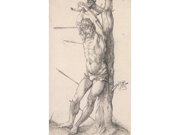 例えば、アルブレヒト・デューラーの《木に結ばれた聖セバスチャン》(1501)は、キリスト教の殉教者・聖セバスチャンを描いた作品。ルネサンス期以降、聖セバスチャンは美しい青年として描かれることが多くなり、その物語にエロティックな解釈も生まれた。