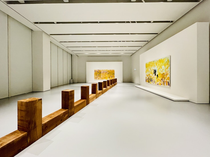 本展は、ジョアン・ミッチェルの巨大絵画2点と、カール・アンドレの彫刻作品1点によって展示を構成。ミッチェルの三連画《Untitled》(1979)と二連画の《Cypress》(1980)は、ともに力強い筆致がエネルギーを感じさせる作品。アンドレの《Draco》(1979-2008)は、31個ものパーツからなる材木を組み立てた全長約19メートルにもおよぶ作品だ。ふたりの展示から、抽象表現主義からミニマル・アートへと移り変わっていく美術の潮流を読み取りたい。