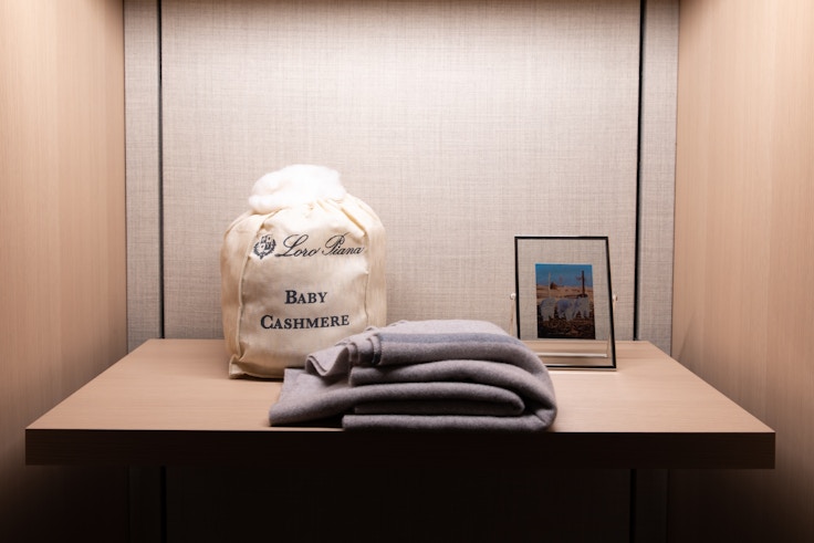 「製品に触れてまず印象的だったのは、ビキューナやベビー・カシミヤといった貴重な素材の感触でした。非常に滑らかで、素肌にふれてもチクチクしない、これまで体験したことのないものでした。温かみがあるのだけどシャープで、視覚的に表現するならば光沢に近いとおもいました。ブランドカラーであるクンメルも、レンガ色なので温かく重みがあるのだけれど、生地に触れるとツルっとしています。本来共存しそうにない要素が、ロロ・ピアーナでは共存し得るのです」。