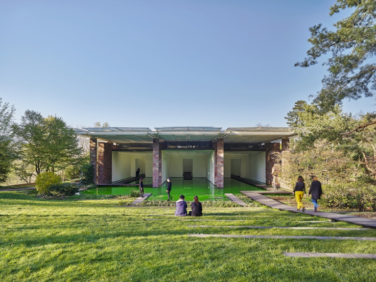 エリアソンは、本展のために同館建物の印象的なガラスのファサードを取り除き、展示室内と屋外の池を結びつけ、連続した水景をつくりだした。鑑賞者は、木製の通路を通じ、虫や人の往来の音、植物や水の匂いを感じながら、展示を楽しむことができる。