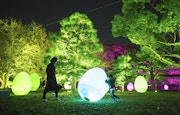 瓢箪池の水面には、浮遊し呼応するランプを浮かべ、人がランプの近くを通る強く輝き音色を響かせ、伝播していく《浮遊する呼応するランプ》を展示。庭園の木々も、人々の動きに応じて明滅する《呼応する木々》となる。さらに「ovoid(卵形体)」と呼ばれる自立する球体も各所に設置され、風や人が左右することで、光と音が変化する。
