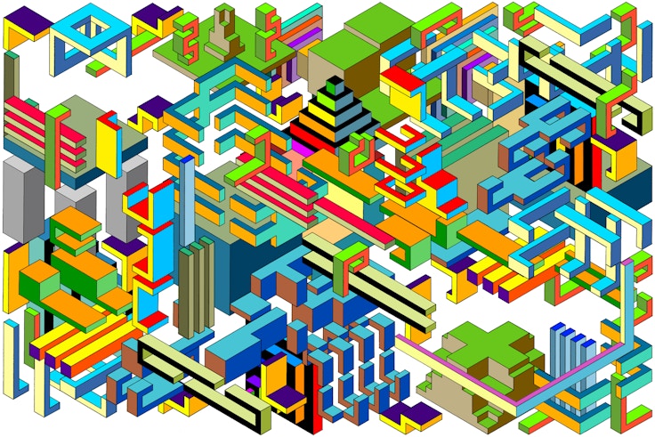 3階で上映されるのは、水江による「MODERN」シリーズ。2018年から21年までの同シリーズを、今回のための再構成した《TOKYO BLOCKS》を見ることができる。都市を彷彿とさせる幾何学的なイメージが高速で変動するその作品からは、日々変化する東京に置き去りにされていく人間の身体やその戸惑い、資本主義へのアンチテーゼが浮かび上がる。