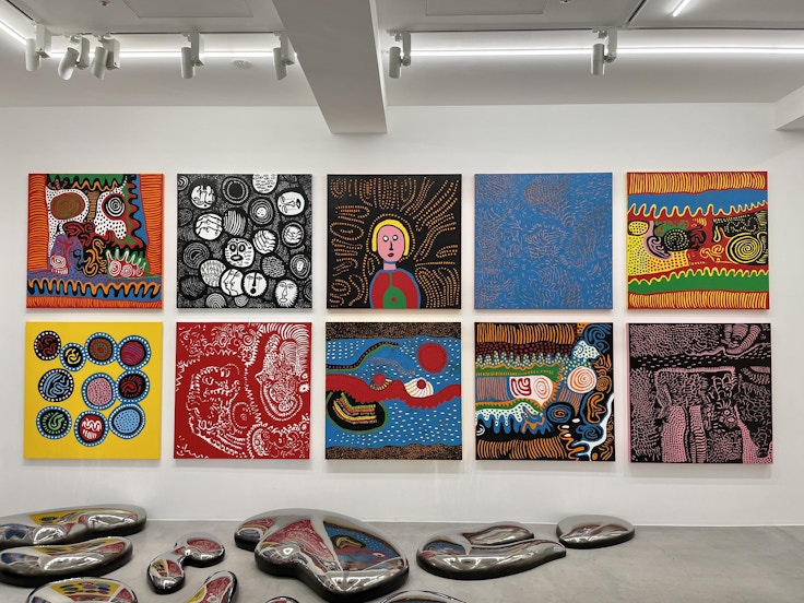 同ギャラリーの東京スペースでは5年ぶりの草間の個展となる本展。草間が2009年から制作を続けてきた「わが永遠の魂」シリーズより絵画33点と、インスタレーション作品《雲》(2019)が展示されており、出品作の多くは、草間が「死」を考えながらつくったものだという。
