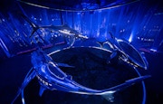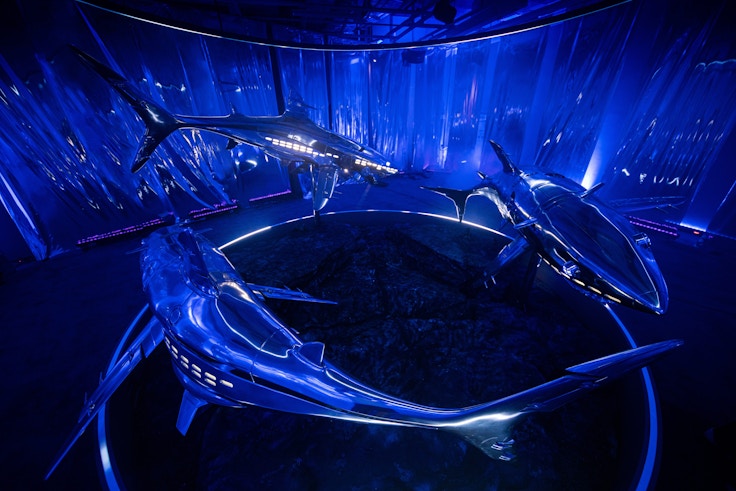 本展では、空山がサメをモチーフにした新作の彫刻作品《Untitled_Giant Shark》が世界で初公開。約1000平米におよぶ展示スペースは本作を手がかりに、「Sinking」「Deep Sea」「Swimming」「Train」という4つの異なるテーマで展開されている。鑑賞者は超現実的な乗り物に搭乗し、架空の深海や時空を舞台に空山の作品世界を体感できる。