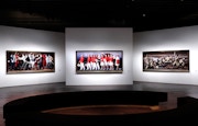 1985年にゴッホの自画像に扮するセルフ・ポートレイト作品を制作して以来、古今東西の絵画や写真に表された人物やモチーフに変装し、その像を独自の解釈で再現してきた森村。本展では、日本洋画史における最重要作品のひとつである石橋財団所蔵の青木繁《海の幸》が制作された明治期以降の日本の文化、政治、思想などの変遷を折り込みながら、「森村式」、略して「M式」と名づけた10連の作品《M式「海の幸」》がハイライトとなっている。