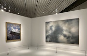 絶えず変化し続ける自然の諸相をテーマに、「雲」「風」「雨」「雪」「霧」などの気象を表現した作品が集まる第1章「空を流れる時間」。このセクションで見られるのが、リヒターのフォト・ペインティング《雲》(1970)だ。展示はポーラ美術館と同じように、隣にモネの作品《舟遊び》(1887)並ぶ。画面中央に配された彼女たちの姿とその水面の反映像が実像と虚像のコントラストを強調した《舟遊び》と、写真をもとに雲を描いたソフトフォーカスの写真のようにも見える《雲》。2つの作品から、到達できないユートピアとしての青空への憧憬が喚起される。