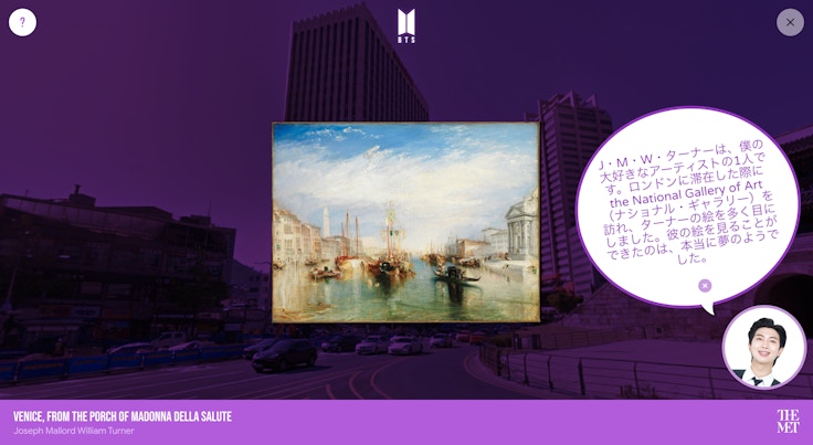 BTS のファングループ「ARMY」の誕生日を祝して7月9日にリリースされら「BTS×ストリート ギャラリー」は、ニューヨークの国際連合本部ビルからソウルの忠宮ビルまで、BTSが訪れた思い出に残る場所7ヶ所をストリートビューで公開。それぞれメンバーが自身のストーリーを語るとともに、メトロポリタン美術館の所蔵品からセレクトした作品をストリートギャラリーとして展示している。