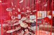 「中華園」の跡地の《巡る記憶―中華園》(2022)は、店舗の記憶を甦らせるように、実際に使われていた円卓や膨大な食器、岡持ち、そして棚などの家具などが赤色のロープによってつながれ、空間を埋めている。宙を舞う食器の数々は、往時の活気をいまに伝えるようだ。