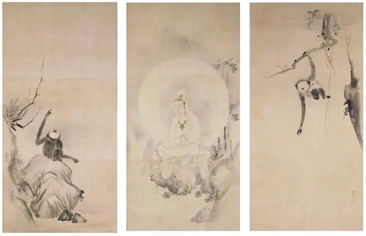 とくに注目すべきは、徳川家康の御用絵師でもあった狩野探幽(1602~1674)が、二人の弟である尚信・安信との合作で完成させた《中観音図・猿猴》だろう。画面構成に優れた作品で、中心の観音像を探幽が、右側の猿を尚信が、左側を安信が描いている。その三者三様な描線の豊かさも楽しみたい。