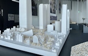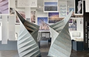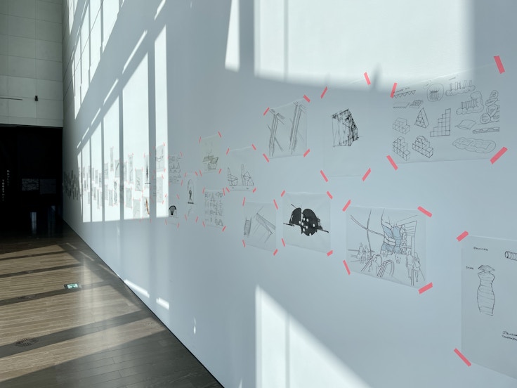 会場デザインもスタジオが手がけた。日本の暖簾や垂れ幕を連想させる多数のバナーが来場者を迎えながら、これまでの多様なプロジェクトの模型や、試行錯誤を重ねた素材サンプルやパーツ、そしてドローイング、インタビュー映像が並んでいる。