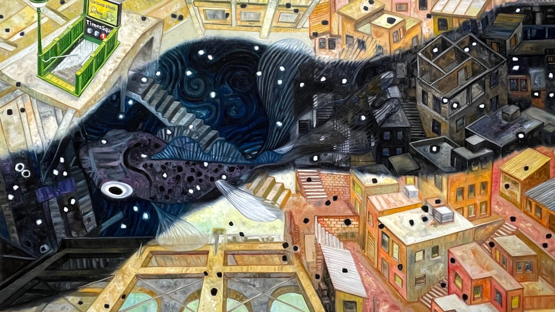 大岩は21年に、1920年代から現代までの時空間を選び、「もしこの時代に生きていたら」という自分をとりまく環境をテーマに油彩と3D映像で表現したシリーズを発表した。アートフロントギャラリーでは21年以来2年ぶりとなる本展では、これまでに描かれた作品の風景を切り取り画面上にちりばめ、その中央部を流れる川や道を思わせる「擬魚化」されたうねりが、異なる時間をつなぎ合わせる。さらにはこの川が空間の中でつながる「円環=ring」作品も発表されるという。またギャラリーの第二室は、川にちなんだ近作で構成される予定だ。