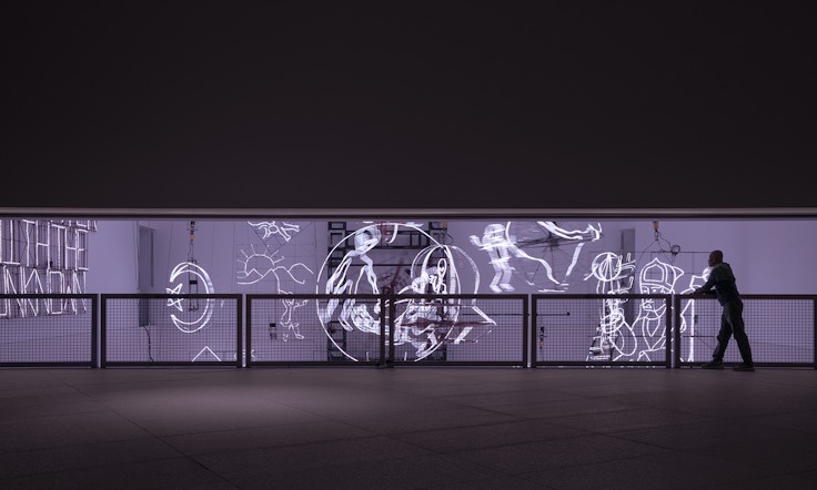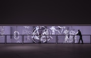 またそれらと隣りあうのは、LEDを使った大規模なキネティック・ライト・インスタレーション《未知との遭遇》。鑑賞者はなかを自由に歩きながら作品を体感することができるというものだ。そのほか、国内の国公立美術館の所蔵品と、日本初公開のガラスや鏡に焼き付けた新作を含む作家所有の約50件の作品を展示。知られざる多数の貴重なアーカイブ資料や記録映像が展示されるとともに、作家自身による一人称の説明も掲示される。