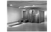 若林は1981年に学内にある工房内に鉄板を立て、自らのために10畳ほどの空間を制作。その後、「鉄の部屋」という通称を持つようになったこのスペースの周囲を鉛で覆い、周辺に植物や大気を表す鉛の板やキューブを配置して《所有・雰囲気・振動―森のはずれ》(1981〜84)として発表した。自分自身が所有できる空間を区切ることで生まれた境界や領域をめぐり、自身を軸とした周縁、自然への思索を一層深めていった本作は、若林本人を含んだ自然や風景そのものの具現化を試みた作品といえる。