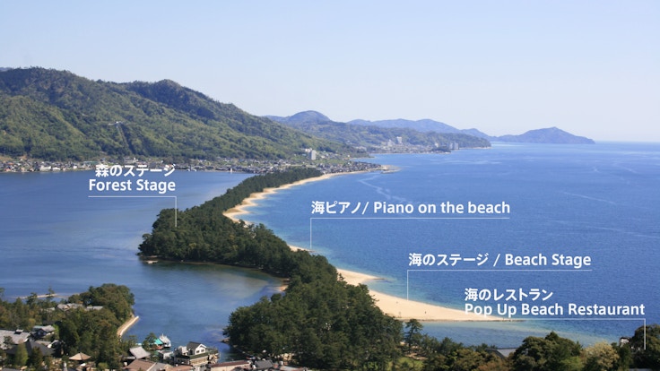 今秋の「KYOTOPHONIE 2O23 天橋立」は、日本三景のひとつであり、京都府北部の宮津湾に面した特別名勝「天橋立」の大自然を舞台に開催。全長3.6キロメートルにおよぶ砂洲に約6700本の松が生い茂る荘厳な景色のなかで、天橋立の白い砂浜と水平線を借景に建てる「海のステージ / Beach Stage」、数百年のときを経て息づく木々と名水・磯清水に囲まれた「森のステージ / Forest Stage」、絶景の砂浜に置かれた駅ピアノならぬ「海ピアノ / Piano on the beach」の3ヶ所にステージが設置される。