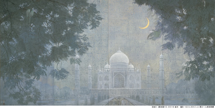 その作風は幻想的であり、描かれる題材は、湿潤な日本の風土やヨーロッパの街並みをとらえた風景画から、ボルゾイ犬をモチーフとした現代的な花鳥画、インド留学が転換期となり描きはじめた人物画までと様々だ。