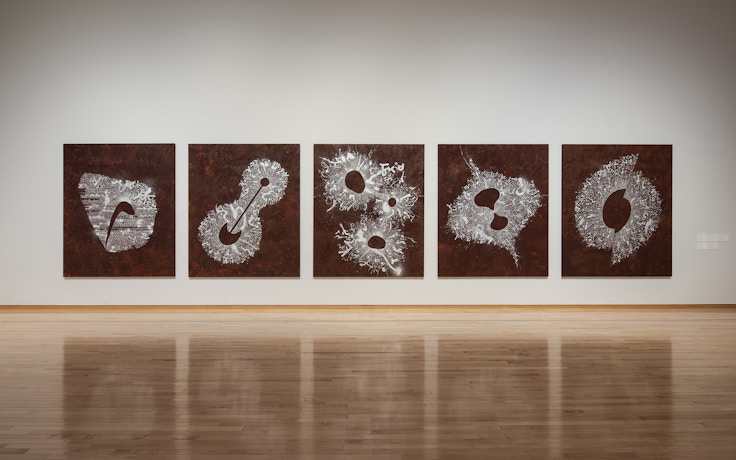 本展では、最新シリーズ「隕石が書く」(2023)40点による大規模なインスタレーションと、近作である「Constellation」(2018‒21)、「Interexcavation」(2019)各シリーズからの作品、そして現地制作される壁画などが展示される。