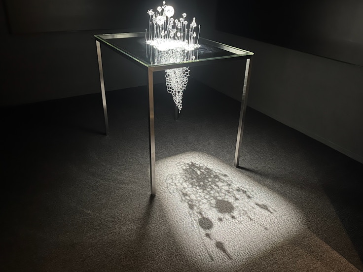 本展では、吉岡による、炎から放たれる「光」に着目したふたつの新作が初めて披露。ひとつは、透明のトーチで炎が空中に浮遊するように設計された《ガラスのトーチ》(2022)。もうひとつは、屋外に展示されている、同じく点火をすると炎が浮遊するように見える《ガラスの炬火台》(2022)だ。いずれも美しい造形を持ちながらも、炎そのものを際立たせるためのデザインとなっている。