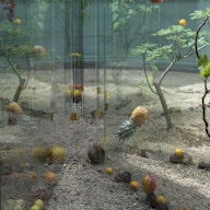 強化ガラス、真鍮、果物、植物 展示風景=広島市現代美術館 撮影=表恒匡