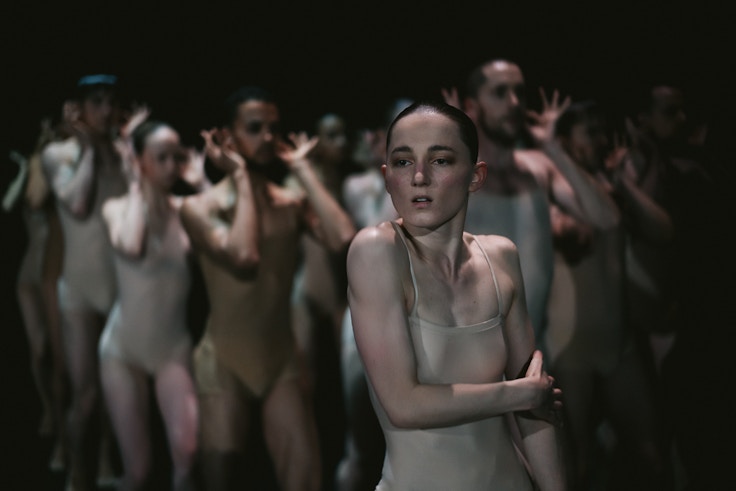日本では初めての本格的な紹介となる、いま世界から注目を集めるイスラエル出身のデュオ、シャロン・エイアール&ガイ・ベハールによる作品。16名のダンサーがヌーディーなボディスーツに身を包み、つま先立ちでバランスをとりつつ身を寄せ合う姿が暗闇から浮かび上がる。繊細かつ強靭な肉体のアンサンブルと身体を内側から揺さぶる低音のビートによる、エネルギーがほとばしる展開にひと時も目が離せない。