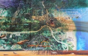 近年は、インドネシアの都市開発や環境汚染といった、自身が同地で生活していくなかで体験・リサーチしたリアルな現状をベースに作品制作をしている。それと同時に、現在起きている問題の直接的な表現にとどまらず、様々なアーカイブ画像を画面上で結びつけることで、インドネシアの歴史や神話、生物の進化や絶滅といった生態系など複数の時間軸を重ねあわせ、より普遍性を持つ作品へと発展させているという。地球環境問題、エコフェミニズム、神話、歴史、政治──それらの要素が同一平面上に並置される今津の絵画には、膨大なイメージや情報が作家の身体を通過することで生み出されるダイナミズムもが可視化されている。