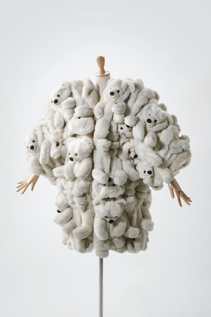 「Chapter 1. 自然にかえりたい」では、自然に対する憧れや敬愛、身にまといたいという願望から生み出された多種多様な衣服を紹介。本展の始まりを飾るチャプターとして、歴史の各時代に現れた動物素材や植物柄のファッションを展示する。華やかな花柄が刺繍された18世紀の男性用ウエストコート、20 世紀前半に流行した鳥の羽根やはく製が飾り付けられた帽子、毛皮不使用や環境保護を標榜するエコファーのコートなどに加えて、人間の毛髪を素材とした小谷元彦の作品が展示される。