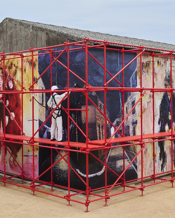 グッチ銀座 ギャラリーで展覧会「横尾忠則 未完の自画像 - 私への旅」を開催中の横尾忠則によるアートウォール《未完の足場》が、瀬戸内の香川県・豊島で公開されている。