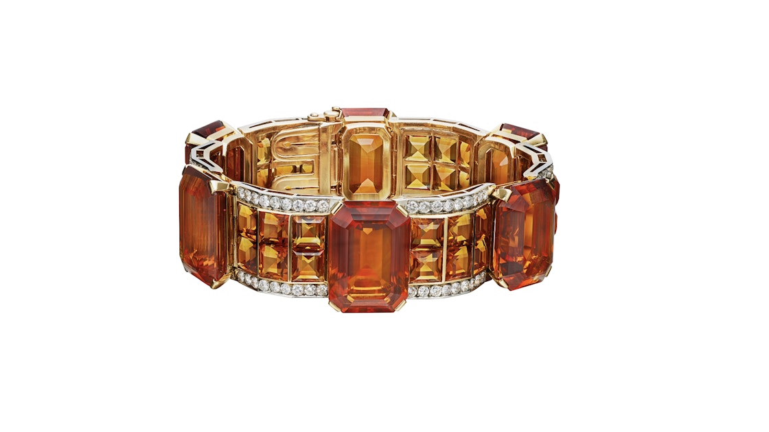 展覧会は3つの章で構成される。第1章「色彩の科学」では、色彩の効果に科学的にアプローチし、厳選されたアイコニックなジュエリーを通して色彩の相互作用を明らかにしていく。イタリア国外では一度も展示されたことのない、ゴールドとプラチナにダイヤモンドとシトリンをあしらった《ブレスレット》(1940頃)は、宝石が放つ豊かなオレンジ色のスペクトルを通して、ローマの夕焼けの温かみのあるゴールドの色調を彷彿とさせる。