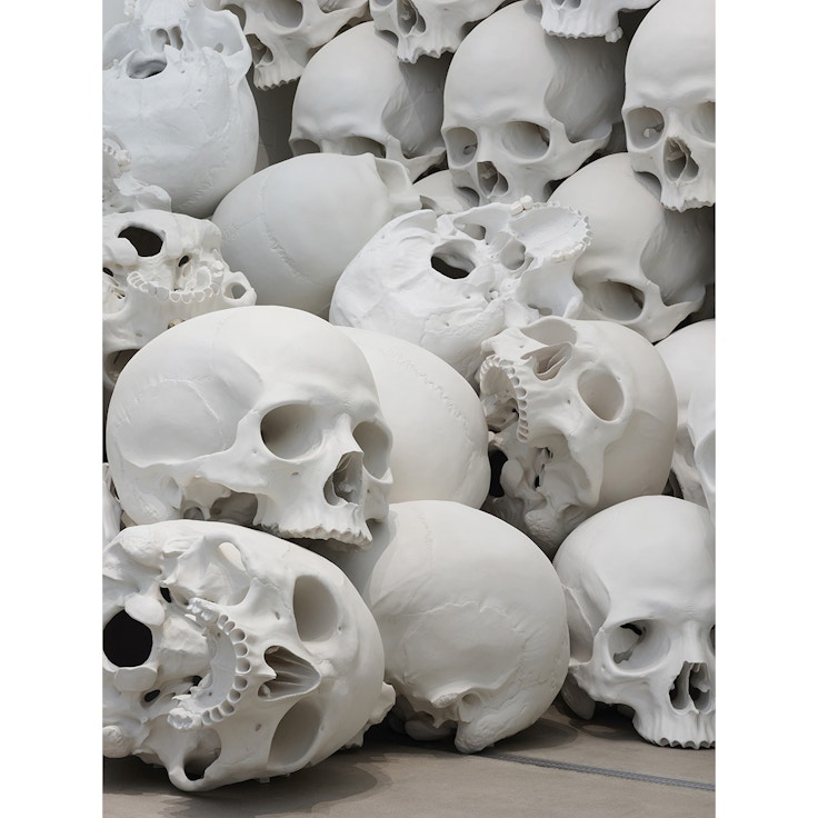 日本初展示となる作品をいくつか紹介したい。例えば、先述の《マス》は、100点の頭蓋骨が山のように積み上げられた、サイトスペシフィックなインスタレーション作品である。頭蓋骨という主題は、「メメント・モリ(死を忘れるな)」というラテン語起源の思想とともに、西洋美術史のなかで繰り返し扱われてきたいっぽう、現代のカルチャーシーンにおいても普遍的に用いられている。
