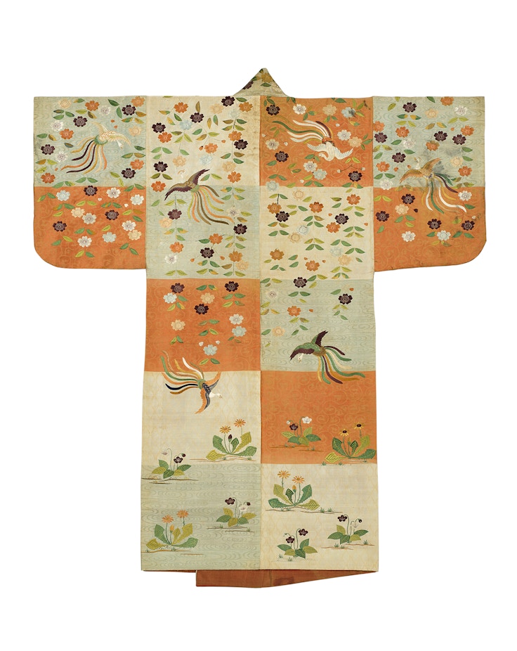 また本展では、同館所蔵品のほかにも、染織コレクターとして知られた野村正治郎旧蔵の「振袖 綸子地御簾檜扇模様」も展示される。さらに『綾錦』から一部の展示作品の掲載ページを見られる貴重な機会となっている。