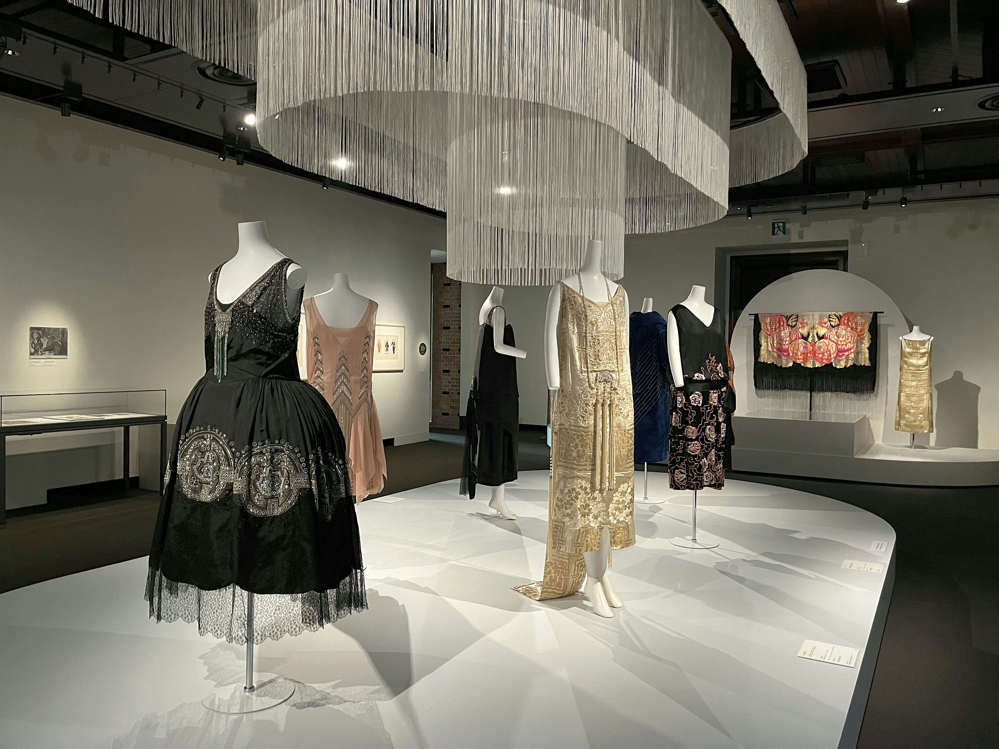本展は、1925年にパリで開催された装飾芸術の博覧会、いわゆるアール・デコ博覧会から100年を迎えることを記念して開催されるもの。1920年代を中心に隆盛したアール・デコ様式と、当時の「モード(流行の服飾)」との関係を多角的に紐解く内容となっている。京都服飾文化研究財団(KCI)所蔵のドレスや服飾資料約200点に加え、同時代の絵画、版画、工芸作品なども展示され、合計約310点が紹介されている。