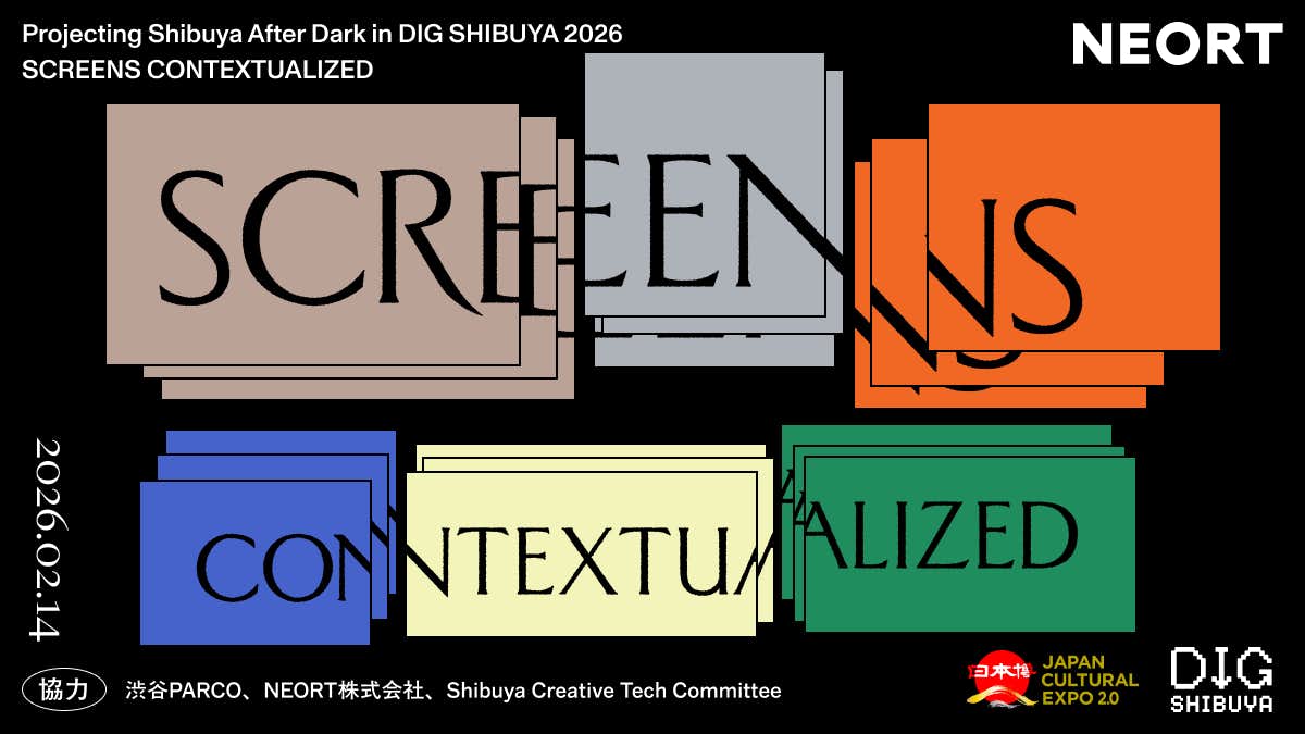 渋谷各所のデジタルサイネージを用いた「SCREENS CONTEXTUALIZED」(2月14日)では、40名以上のアーティストが参加し、街全体を「屋外美術館」へと変換。スクリーンが置かれた場所の記憶や歴史的文脈を読み替えながら、デジタル・パブリックアートを展開する。夜間には渋谷PARCOとNEORTが映像作家・プログラマーの岡本斗志貴を迎え、PARCO渋谷店の壁面でプロジェクションマッピング「Projecting Shibuya After Dark」を実施。昼と夜で異なる都市の表情を浮かび上がらせる。