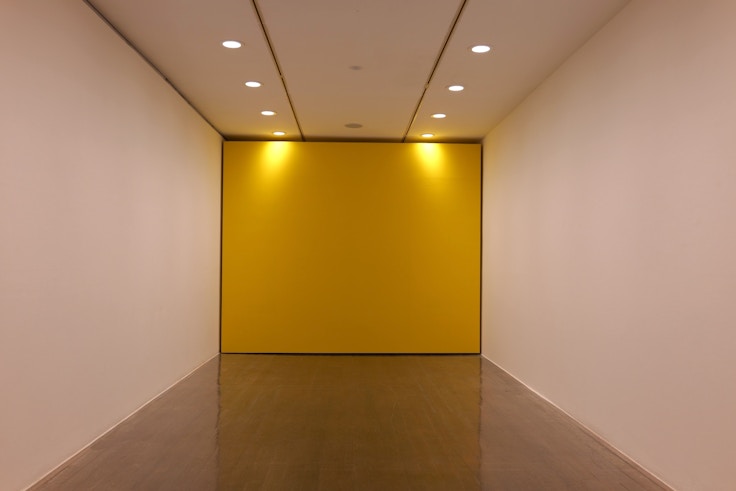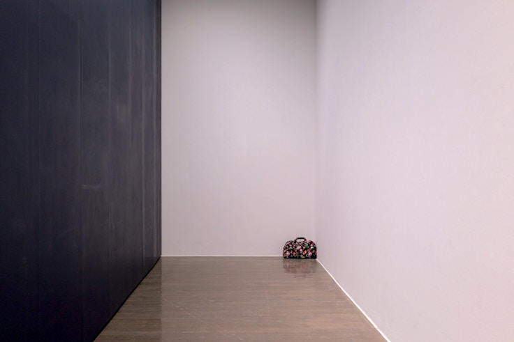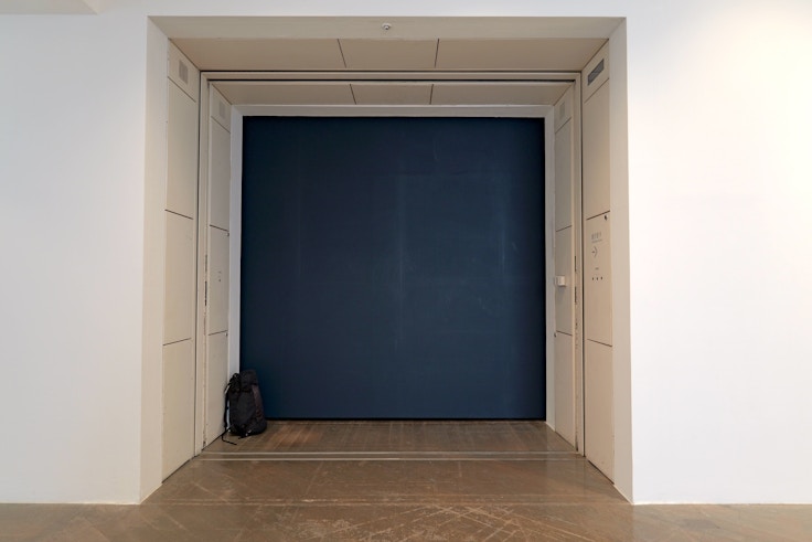 まず、会場の入り口には濃紺に塗られた壁のような木製の構造物とリュックサックが置かれている。ひと目見ると壁面のようであるが、これはれっきとした会場の入り口だ。観客はこの入り口をどうにかして開き、その驚きとともに会場へと入ることになる。ここからすでに飯川の作品《デコレータークラブ─配置・調整・周遊》(2026)が始まっている。
