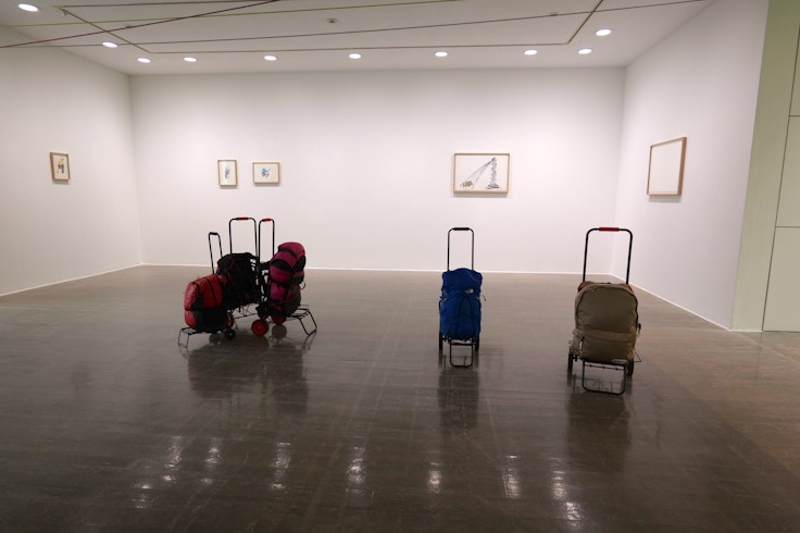 《デコレータークラブ─配置・調整・周遊》に対してアクションを繰り返していくと、複数の作品が並んだ展示室にたどり着く。ここには数点のドローイングとともに、スポーツバッグが乗ったキャリーカートがいくつか置かれている。このキャリーカートは作品《デコレータークラブ─0人もしくは1人以上の観客に向けて》(2026)で、観客は本作を、本展と会期が重なっている飯川の個展「デコレータークラブ: 重いバッグの中身」(4月4日〜5月23日、KOTARO NUKAGA、東京・天王洲)や、αM2025–2026企画「立ち止まり振り返る、そして前を向く」(4月11日〜6月13日、gallery αM、東京・市ヶ谷)の会場へ運搬することができる。