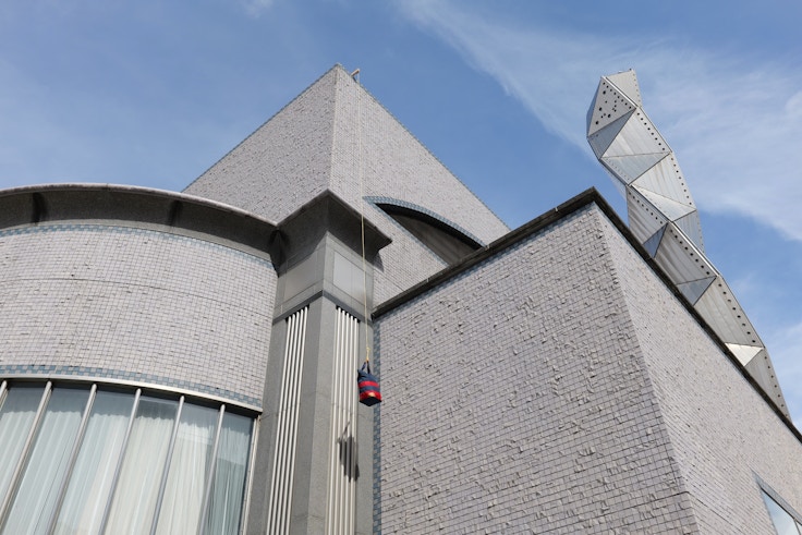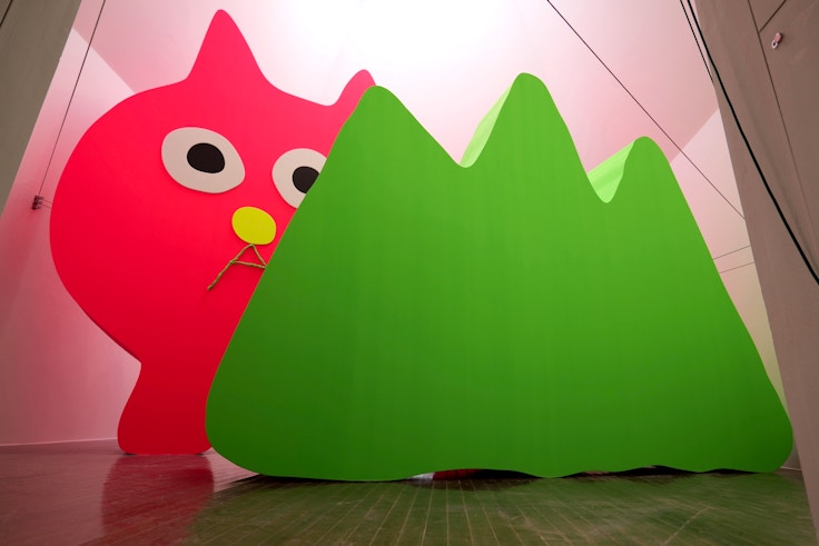 隣接する展示室では、飯川のアイコンとでもいうべき、ピンクの巨大な「猫の小林さん」が、展示室からはみ出さんばかりに展示されている。本作《デコレータークラブ─ピンクの猫の小林さん》(2026)は、まさに写真を撮影しSNSでシェアしたくなるようなキャラクター性があるが、しかし大きな山型の展示物に半分が隠れていて全容が見渡せないうえ、その巨大さゆえにカメラの画角にすべてを収めることが難しい。これも飯川が意図したところで、対象を見るという行為が、スマートフォンのカメラで撮影しシェアすることと等価になっている現在において、作品がそれを阻害し切り離すことができるのか、という実験でもある。